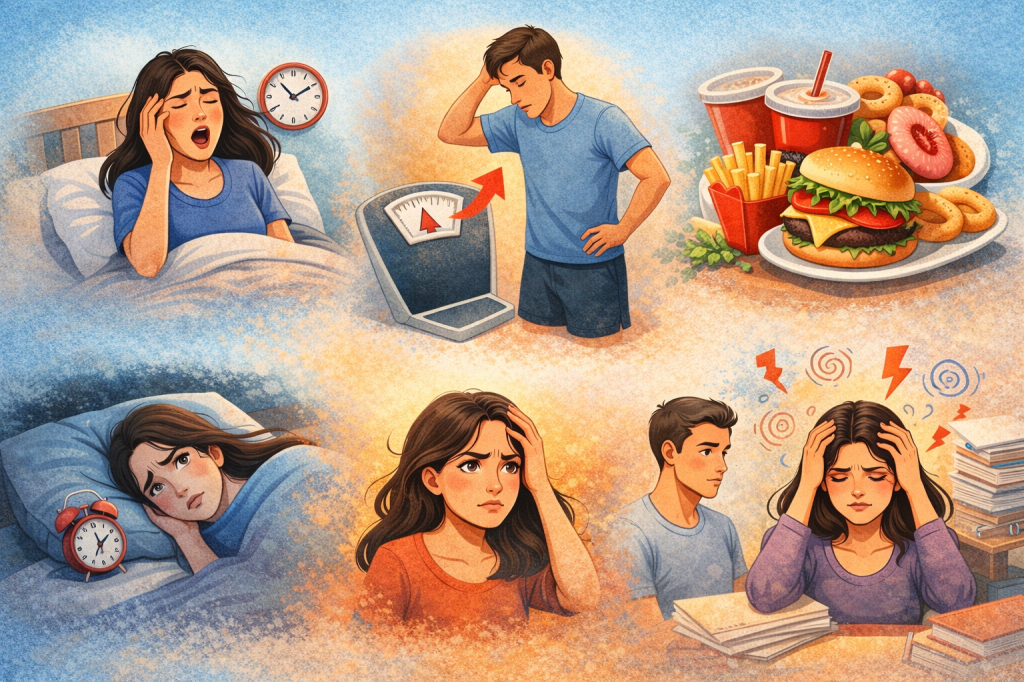 Stress and poor sleep are closely linked. Inadequate sleep further disrupts metabolic regulation, creating a cycle that is difficult to break.